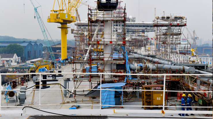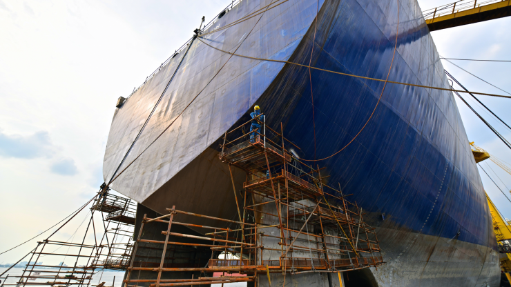 During the dry dock phase, all sea valves and underwater surfaces are inspected; the bow thruster is removed for overhaul and replaced with the fleet spare; tail shafts, part of the ship’s propulsion drive system, are removed and inspected; controllable pitch propellers are disassembled, overhauled in the shipyard shop and reinstalled; the vessel’s entire exterior is cleaned and repainted; and the rudders are inspected again.